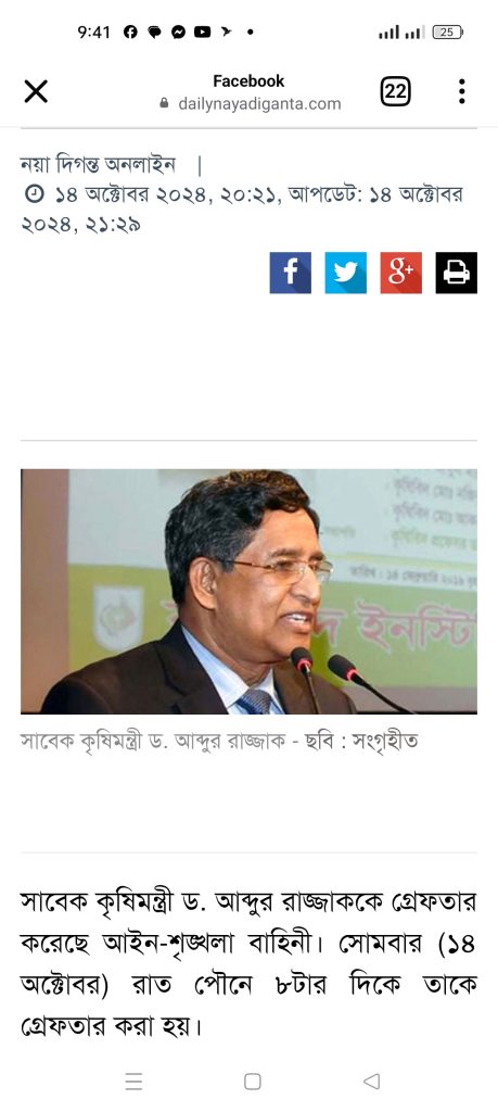 সাবেক কৃষিমন্ত্রী ড. আব্দুর রাজ্জাককে গ্রেফতার করেছে আইন-শৃঙ্খলা বাহিনী। সোমবার (১৪ অক্টোবর) রাত পৌনে ৮টার দিকে তাকে গ্রেফতার করা হয়।